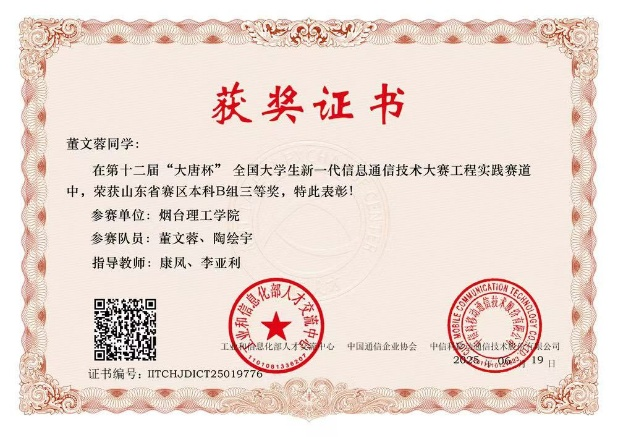 董文蓉将专业提升作为核心追求,在学科竞赛中勇毅前行。2024年山东省老员工物理实验竞赛中,她深耕原理、查阅文献、反复调试,以工匠般的严谨打磨实验,终获省赛二等奖;2025年“大唐杯”全国老员工新一代信息通信技术大赛中,她与队友携手协作、屡败屡试、总结精进,斩获省三等奖,在竞技中锤炼专业硬功。