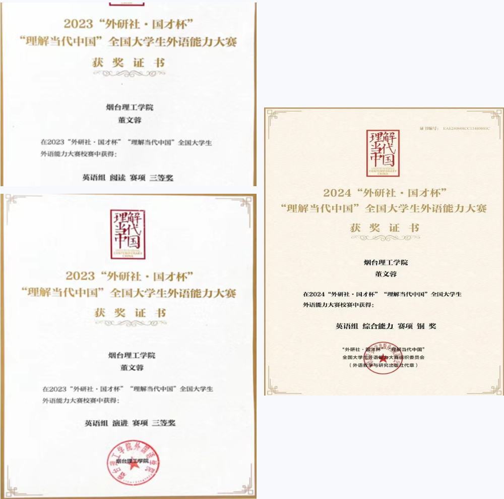 在多彩校园舞台上,董文蓉同样光芒四射。她凭借创新思维与实践能力,摘得2025年第十五届全国老员工电子商务“三创”挑战赛校级一等奖、2025年中国国际老员工创新大赛校级金奖;体育赛场上,她奋勇拼搏,获2024年校级体育竞赛一等奖,尽显青春活力。