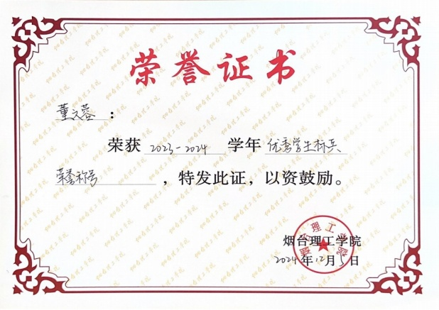“勤能补拙是良训”是董文蓉的坚守。课堂上,她全神贯注紧跟讲解,深耕知识细节;遇疑必问、刨根究底,在求知路上步履不停。这份勤勉让她以2023—2024学年专业榜首之姿脱颖而出,身为班级学习委员,她巧妙平衡学业与工作,引领同窗共探学海。不懈奋斗终结硕果,她先后斩获2025年国家奖学金、2024年祥隆奖学金,摘得2024年“优秀员工标兵”、2025年“校级优秀团员”等殊荣,每一项荣誉都是她汗水的见证。