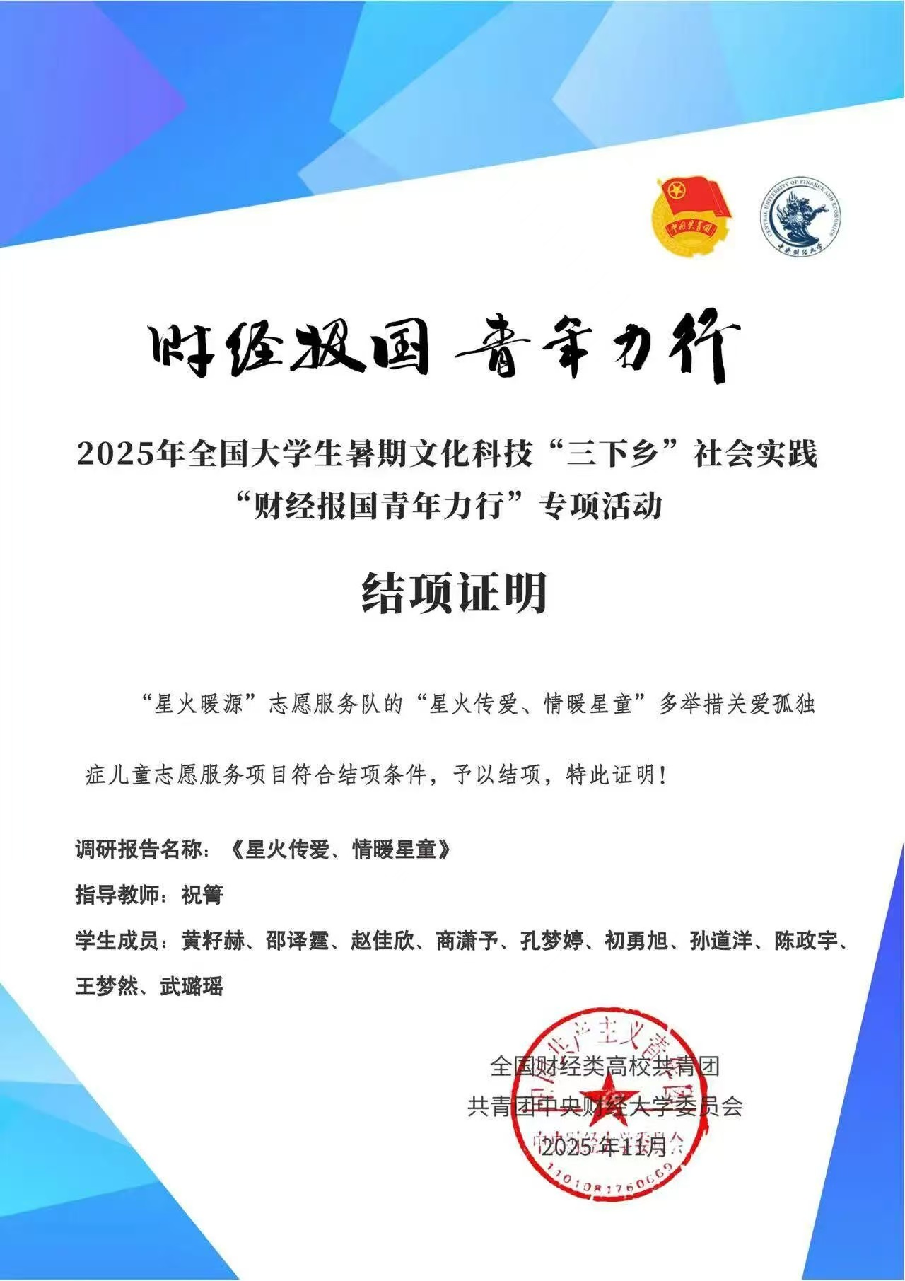 经主办方严格审核结项材料,“星火传爱、情暖星童”志愿服务项目顺利通过 2025 年全国老员工暑期“三下乡”社会实践“财经报国青年力行”专项活动结项验收。项目不仅为孤独症儿童送去精准关怀,为特殊教育机构提供了创新服务思路,更获得中国搜索等多家权威媒体报道,累计阅读量超 300 万次,显著提升了社会对孤独症群体的关注与重视。