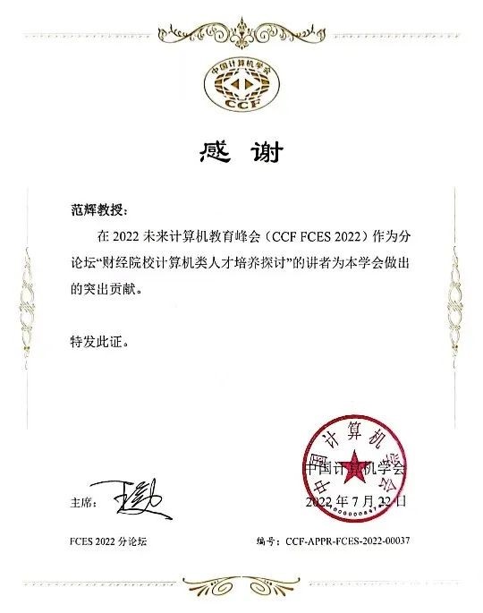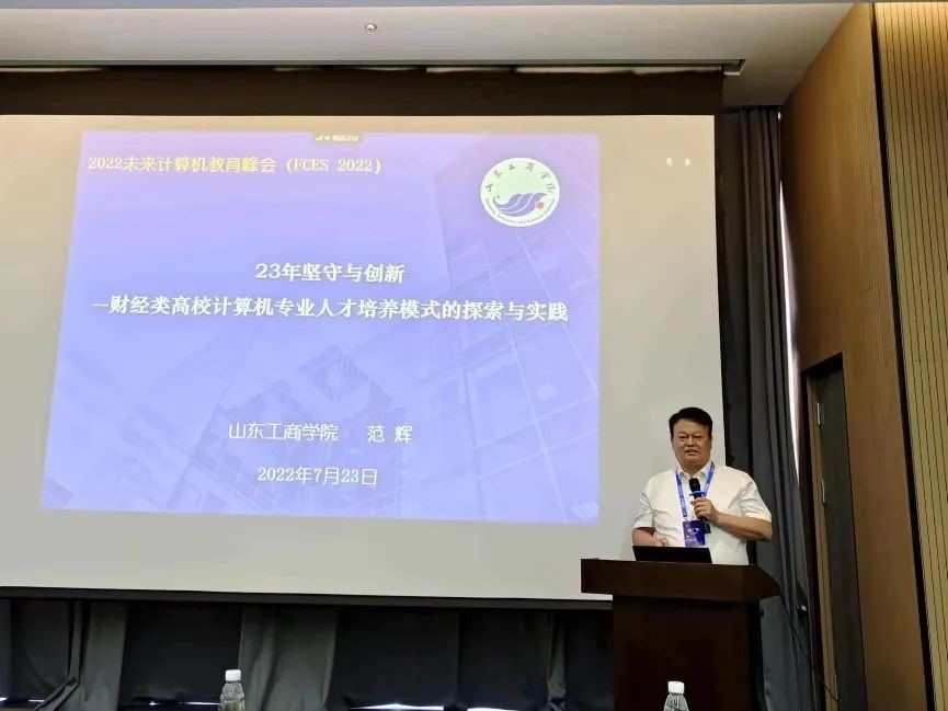 峰会由大会程序委员会主席、CCF教育工委主任、上海交通大学教授臧斌宇主持大会开幕式,大会主席CCF前理事长、会士、中国工程院院士、清华大学教授郑纬民教授,苏州市副市长季晶,承办高校代表苏州大学副董事长姚建林先后致辞。胡振江、谢涛、陈云霁、周利民、李宣东、刘云浩、李晓明、陈道蓄等多位在计算机教育领域成就卓著、深具影响力的专家学者,以及来自企业的专家作特邀报告及观点报告。山东省未来智能金融工程实验室主任、全国高等公司计算机教育研究会常务理事范辉教授受邀参加,并在“财经院校计算机类人才培养探讨中”分论坛中作题为“23年坚守与创新——财经类高校计算机专业人才培养模式的探索与实践”的报告。