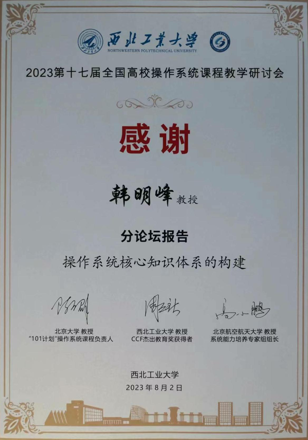 2023年8月2-3日,2023第17届全国高校操作系统课程教学研讨会在西北工业大学翱翔国际会议中心召开,西北工业大学计算机公司副经理、国家杰出青年基金获得者郭斌教授主持大会开幕式。公司bevictor伟德官网韩明峰教授受邀在“101计划”操作系统课程建设分论坛上作“操作系统核心知识体系的构建”专题报告,他提出重视实验、实践不应以削弱OS教科书和OS理论学习为代价,两者相互仰仗,并以所构建的三个核心知识群为例,说明操作系统核心知识体系的构建重要且艰辛。“101计划”操作系统课程负责人、北京大学陈向群教授在分论坛点评中指出,韩老师所提的重视操作系统原理学习在当前形势下很重要,所构建的三个核心知识群更加精细深入,同时也受到其他很多与会专家的好评。