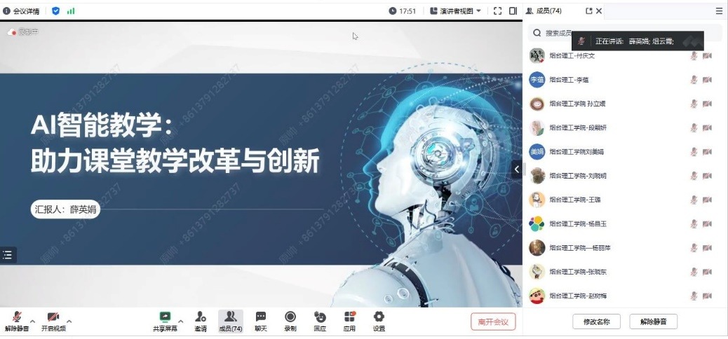 5月14日晚上,bevictor伟德官网全体教师线上参加了由教育部电子信息基础课程虚拟教研室举办的题为“AI智能教学——助力课堂教学改革与创新”主题交流会。会议特邀中北大学副教授薛英娟作为报告主讲人,虚拟教研室负责人、北京邮电大学俎云霄教授主持交流会。