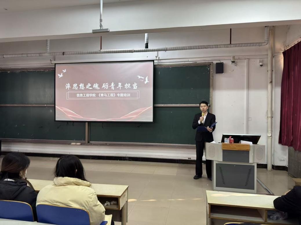培训紧扣培养青年马克思主义者的核心任务,分三大核心模块有序开展。往届青马工程优秀学员代表陈鲁川围绕思想理论武装模块领学,深入解读马克思主义青年观内涵,引导学员把握理论学习与青年成长的辩证关系,筑牢信仰之基;25届青马工程优秀学员代表孙道洋聚焦员工工作实践模块分享,结合典型案例指导学员明晰履职思路、掌握工作方法,树立“以学促干、以干践学”的理念;团总支员工副书记商潇予立足青年责任担当模块阐释,号召学员在服务同学、投身实践中锤炼本领,以实干彰显担当。随后,王明印书记进行总结,深入阐释青马工程核心要义,肯定过往工作成效,并对全体员工干部提出“三颗心”要求:秉持进取之心,深学马列主义、坚定理想信念;常怀善良之心,践行奉献精神、主动帮助同学;保持平常之心,摒弃功利思想、踏实履职尽责,为学员成长指明方向。最后,王明印、祝箐老师为青马工程优秀学员颁发聘书,表彰其在思想引领、组织建设等工作中的突出表现,激励全体学员以榜样为镜,勇担时代重任。